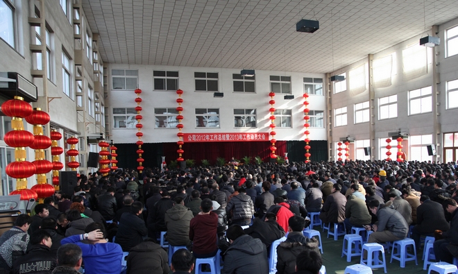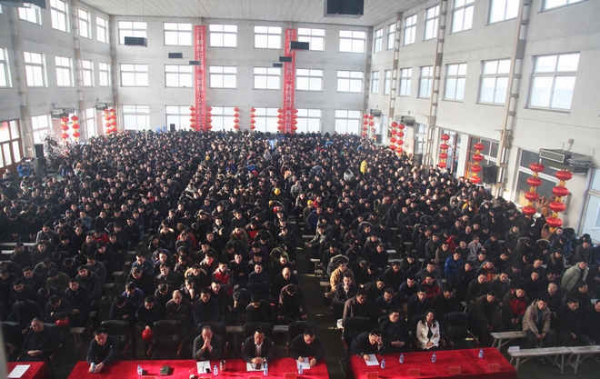 2月16日农历初七,是春节后第一个工作日,公司1500名员工(不包括在岗员工)欢聚一堂,在网球场召开每年一度的全体职工大会。